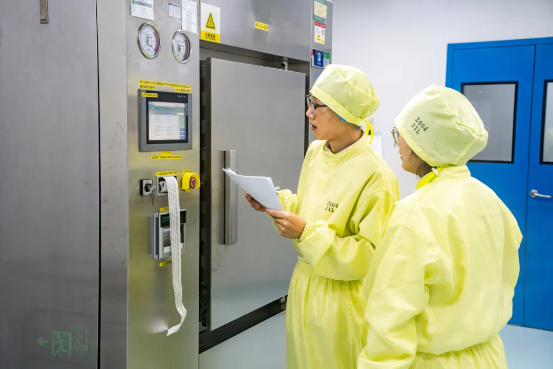 白圣路(左一)查看蒸汽灭菌柜运行过程中数值