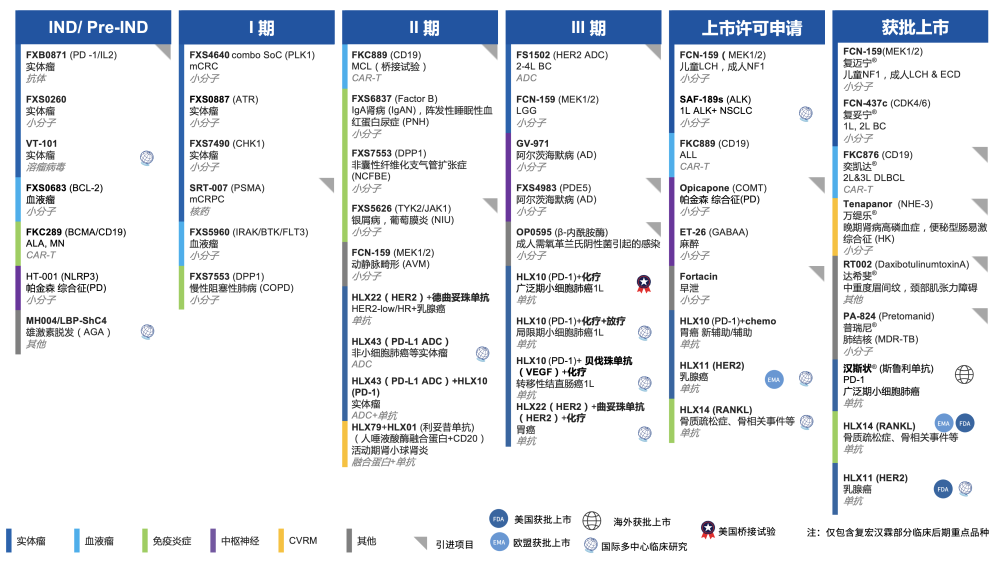 复星医药以创新药为发展重点,围绕肿瘤(实体瘤、血液瘤)、免疫炎症、神经退行性疾病三大核心领域,通过自主研发、合作开发、许可引进等持续强化管线建设。